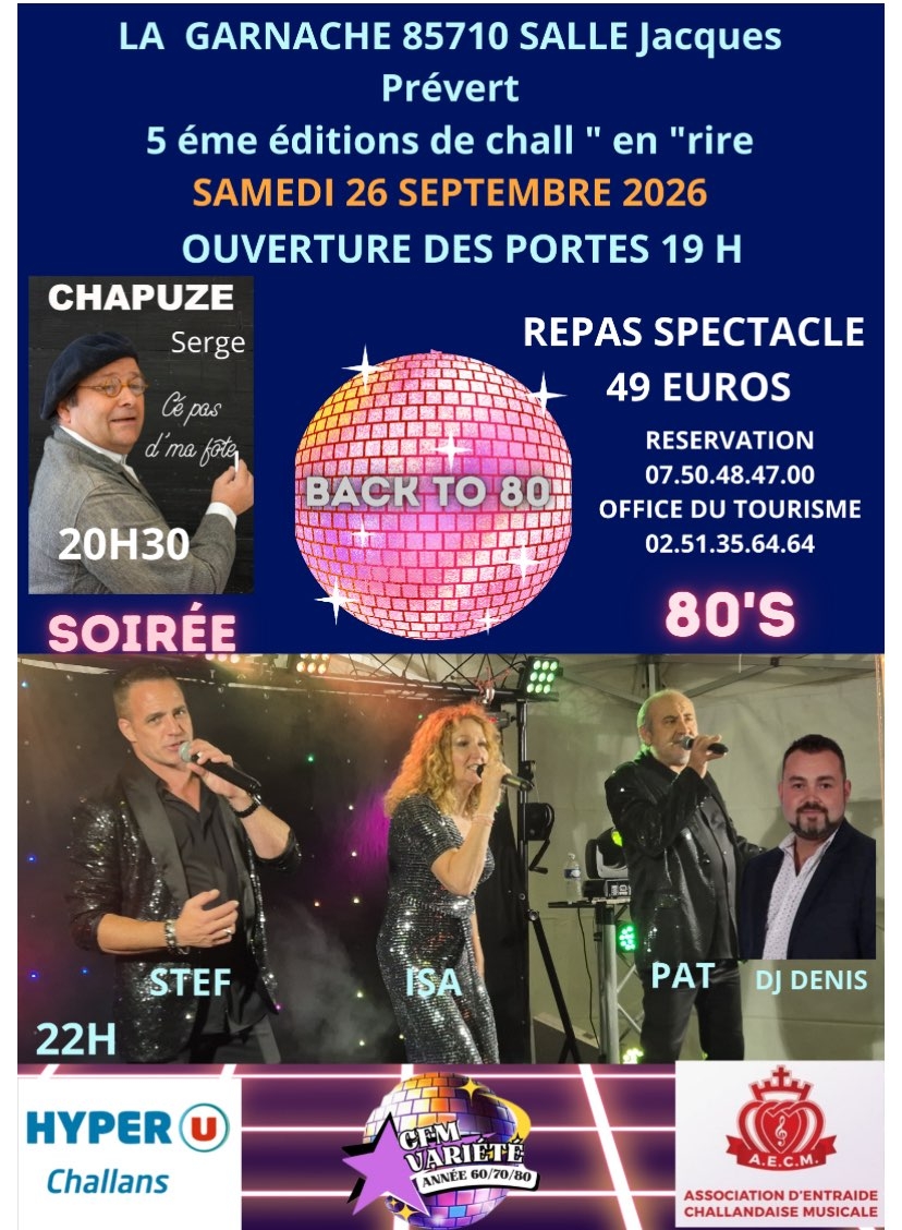 Pour cette 5ème édition de Chall’en Rire, retrouvez des artistes et humoriste tels quer Chapuze, Isa, Pat Steph et DJ Denis. La soirée sera placée sous le thème « Back to 80’s »